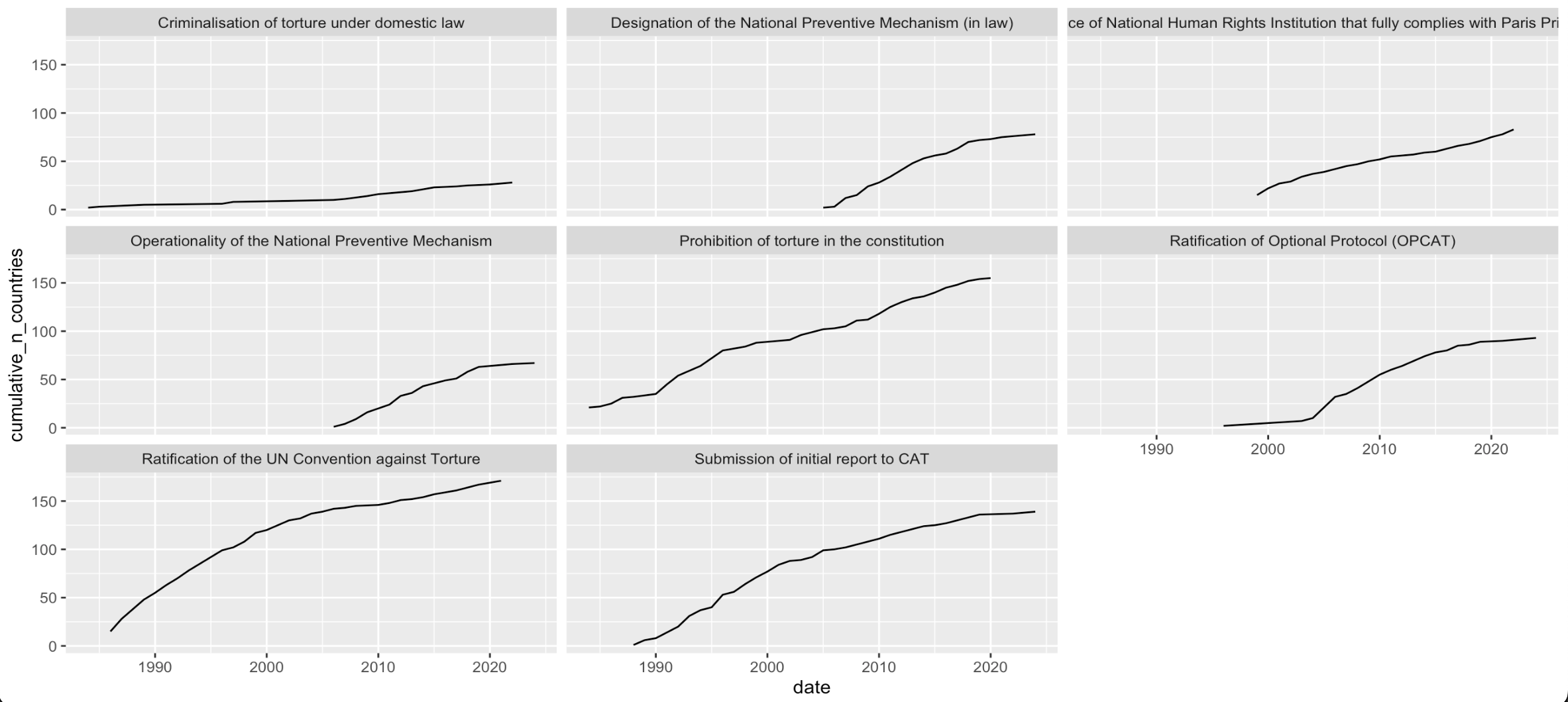 I also combined APT’s two “National Preventive Mechanism” (NPM - a type of oversight system) measures into a single measure. NPMs take multiple stages to implement, and APT provided the date each state completed the first step (“designating” an NPM) and the last step (when the NPM becomes “operational”). I used this data to calculate the number of countries with a designated and operational NPM, as opposed to a designated only NPM, and treated these statuses as different levels of the same legal measure. Compared to reporting the total number of designated NPMs (regardless of whether they are operational or not), this approach allows us to easily see 1) how many designated NPMs need to become operational, and 2) see designated-only NPMS convert to fully operational NPMs over time.