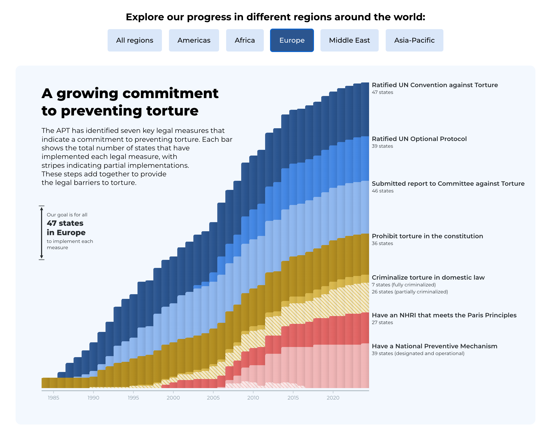 APT asked VFSG volunteers to visualise data on several legal measures, such as United Nations standards, that help prevent torture. For each legal measure, they provided data on whether each of 196 tracked states (i.e., sovereign entities such as countries) have implemented each measure and, if so, the year the state implemented it.
