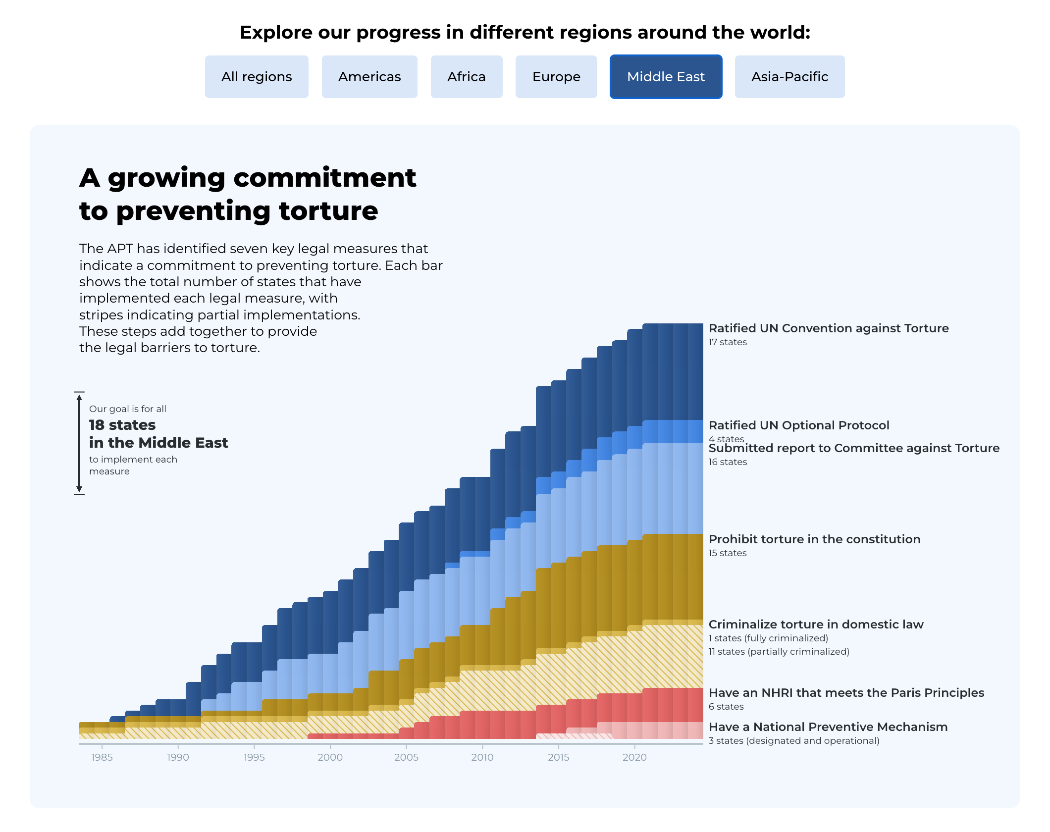 APT emphasised that the visualisations needed to be positive and celebrate progress. They also wanted to provide opportunities to compare legal measures, global regions, and states, but without “naming and shaming” regions or states that hadn’t made as much progress. They sought interactive visualisations to add to their website, but also wanted the option to use them in a static form for publications.